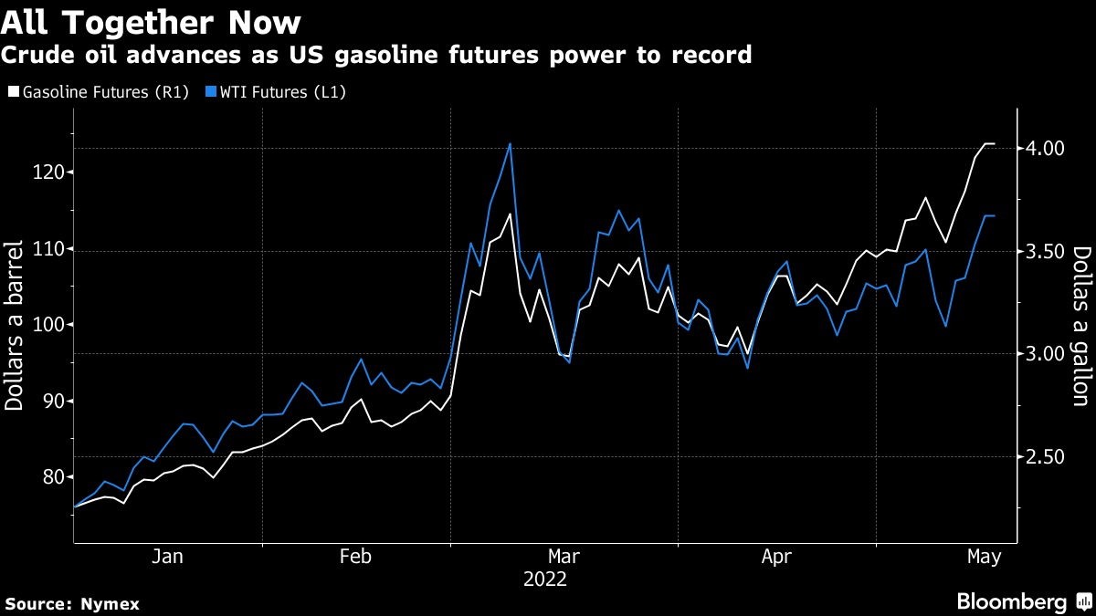 West Texas Intermediate traded below $114 a barrel after rallying more than 14% over the previous four sessions.. With just a couple of weeks to go before the start of the US summer driving season, gasoline has surged to a record on expanding demand coupled with restrained refining capacity.