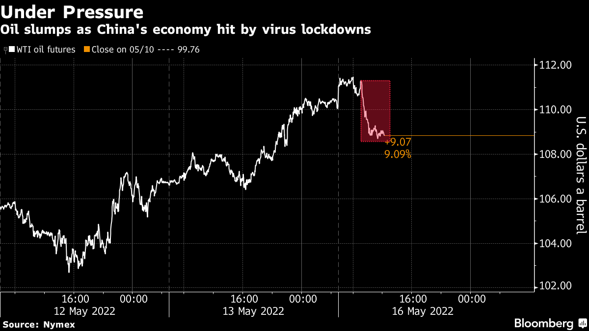 West Texas Intermediate slid to trade near $109 a barrel, reversing earlier gains. China’s industrial output and consumer spending slumped in April to the worst levels since the pandemic began, while apparent oil demand and crude processing plunged. Strict lockdowns to halt the virus have curbed fuel use.