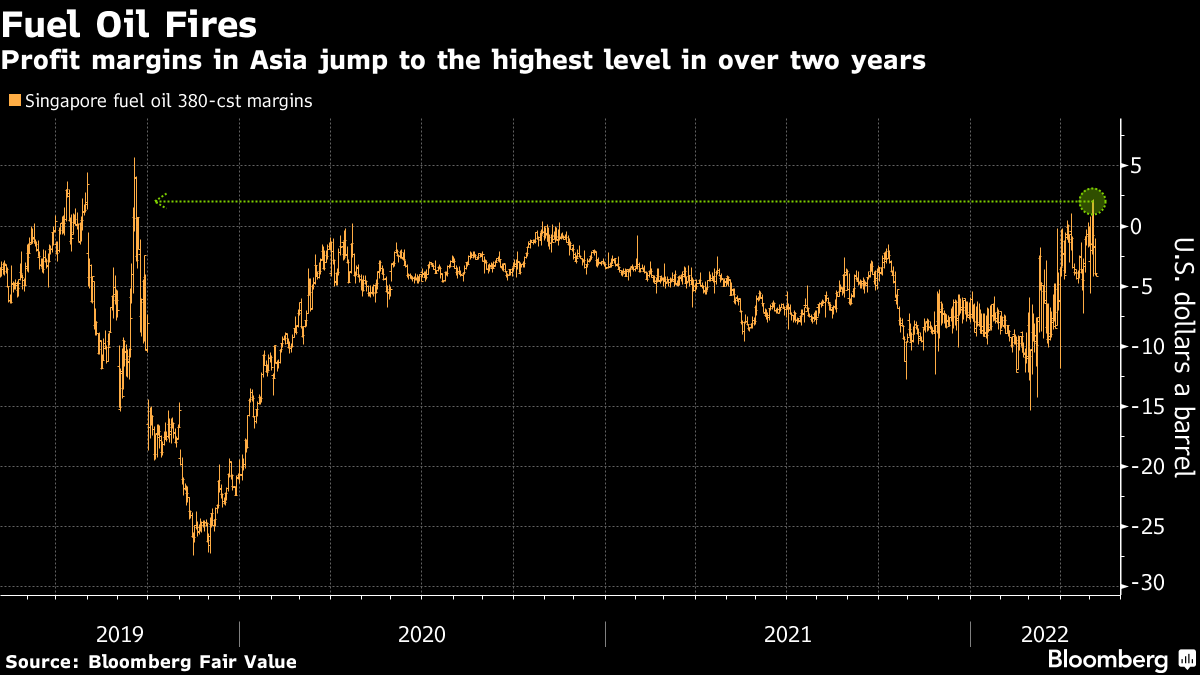 Profit margins in Asia have rebounded for fuel oil -- often used in shipping and the least valuable mainstream refined product -- rising to its highest premium in more than two years on Wednesday. Russian shipments have dropped after most buyers shunned its energy products due to the war in Ukraine.