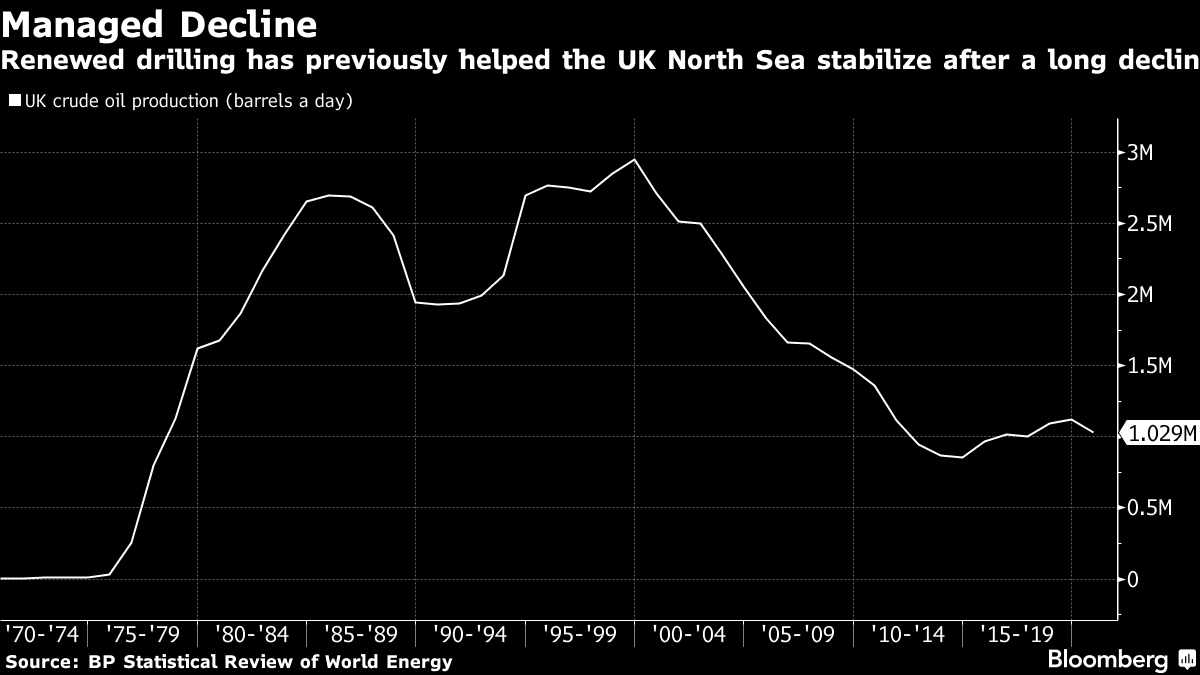 The decline could be halted and the current flow of hydrocarbons maintained for a decade if the country developed all remaining commercially viable resources, according to Wood Mackenzie Ltd. That would hardly be transformational for the UK economy -- the North Sea is too old for such feats -- but it would make it a lot easier for the country to implement the ban on Russian oil and gas announced March.