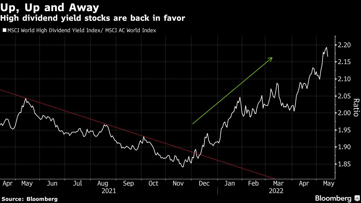 As companies navigate a world of rising borrowing costs and input prices, stocks offering investors income via higher dividend yields are being rewarded by the market. The MSCI World High Dividend Yield gauge, which is estimated to offer a yield of 3.8% over the next 12 months, has outperformed its broader peer by more than 10 percentage points this year.