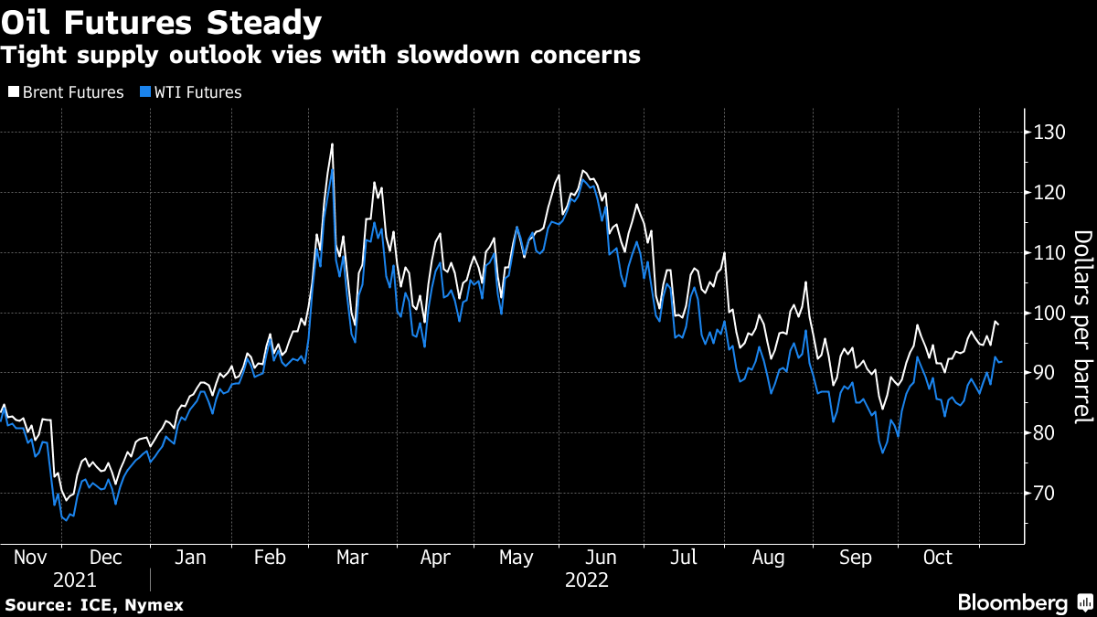 West Texas Intermediate was little changed below $92 a barrel, after easing on Monday as China reaffirmed its commitment to Covid Zero as local cases climb. Traders are gauging the likely impact of looming European Union curbs on Russian oil flows amid the war in Ukraine, as well as the recent move by the Organization of Petroleum Exporting Countries and its allies to curb production.