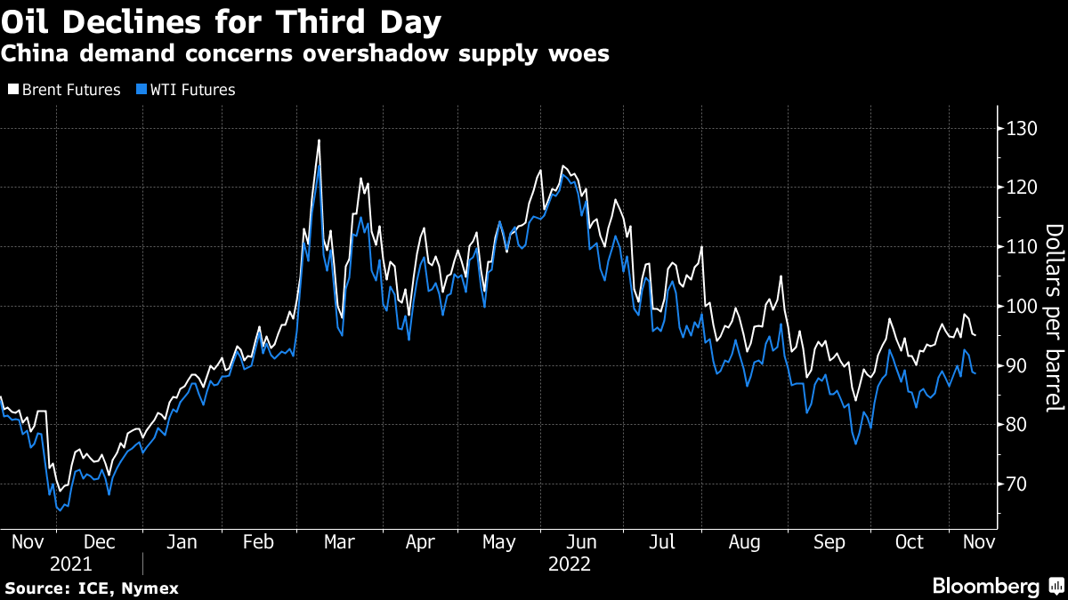 West Texas Intermediate fell toward $88 a barrel after sliding 4% over the first two days of the week. Swelling virus outbreaks in China show the strain the Covid Zero strategy is facing, with even harsh lockdowns and mass testing failing to bring them under control. In the capital, Beijing, cases hit the highest in more than five months, with 78 new infections reported for Wednesday.