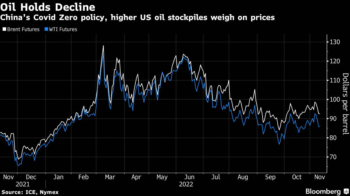 West Texas Intermediate traded below $86 a barrel, after losing 3.5% on Wednesday as data showed US crude stockpiles hit the highest since July 2021. China’s anti-virus policies are hurting consumption, with the country now adding curbs in the southern manufacturing hub of Guangzhou.