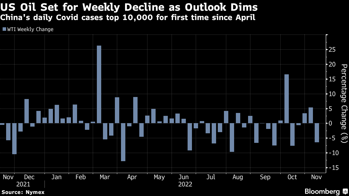 (Bloomberg) -- Oil headed for a weekly loss of over 6% as China continues to grapple with swelling Covid cases, weighing on the outlook for demand.