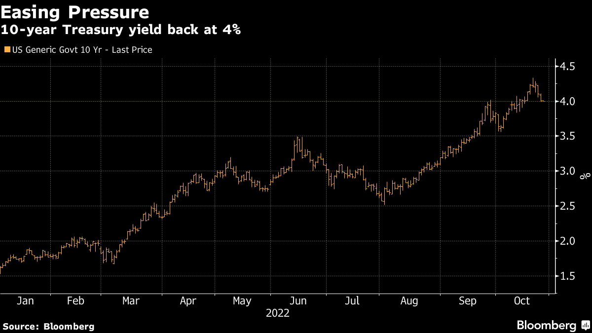 The yield on the 10-year Treasury bond sat around 4% after inching below the threshold earlier, with investors positioning for less aggressive rate hikes as earnings and economic data indicate a slowdown. The benchmark US yield has dropped more than 20 basis points over the past two days.