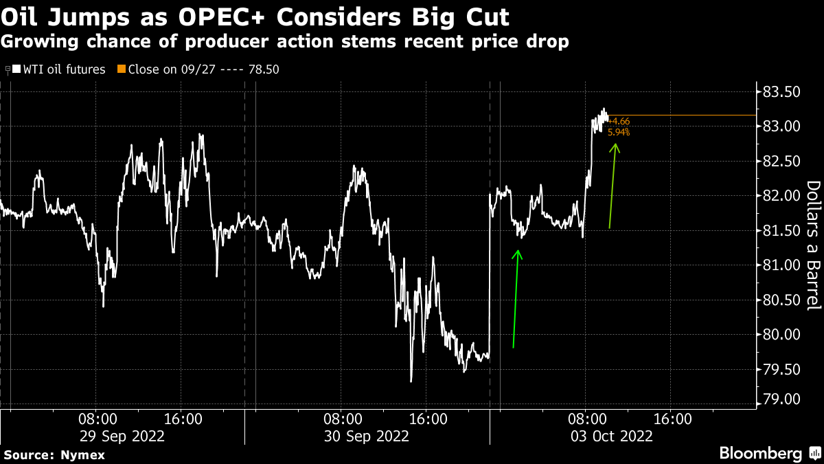 A reduction of that magnitude would be the biggest since the pandemic, although OPEC+ delegates said a final decision on the size of the cuts won’t be made until ministers gather in Vienna on Wednesday. West Texas Intermediate rose as much as 5.5%, the biggest intraday gain since July.