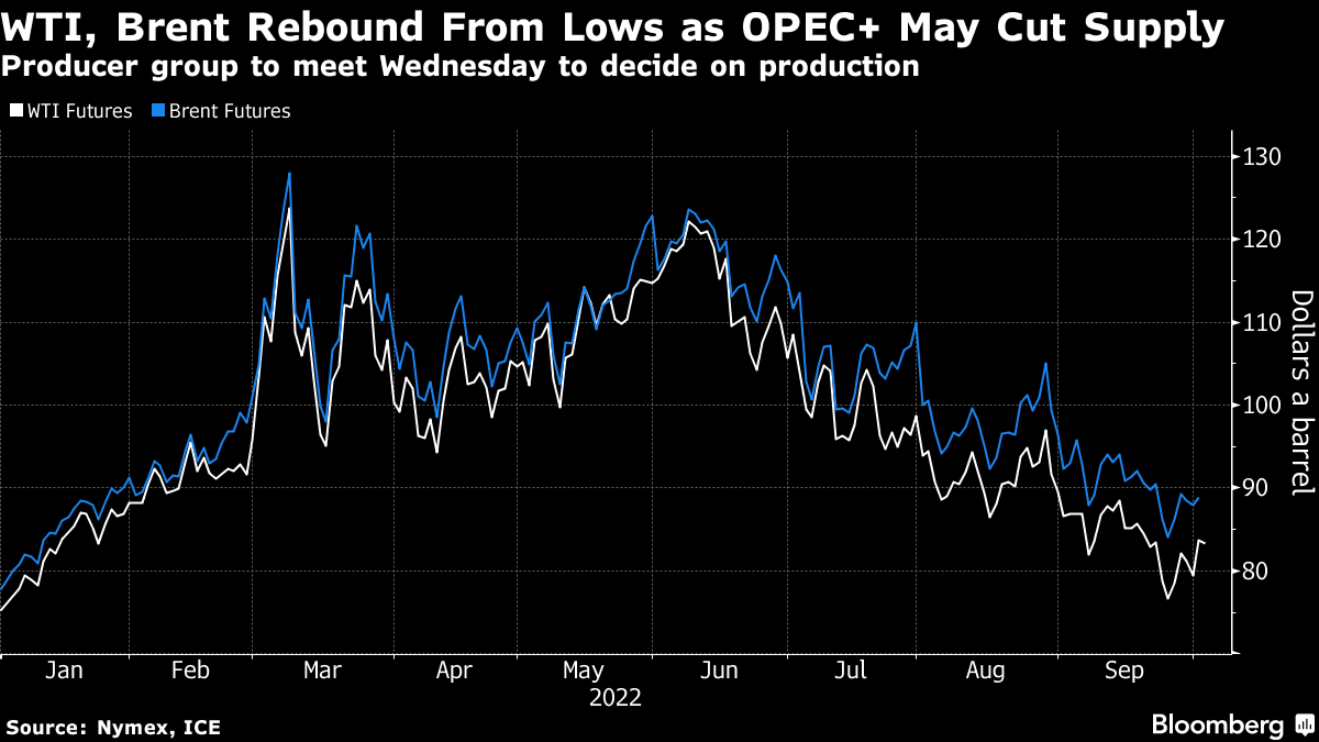 West Texas Intermediate traded near $84 a barrel after rallying by more than 5% on Monday. The Organization of Petroleum Exporting Countries and its allies including Russia will consider reducing output by more than 1 million barrels a day when they meet on Wednesday, according to delegates.
