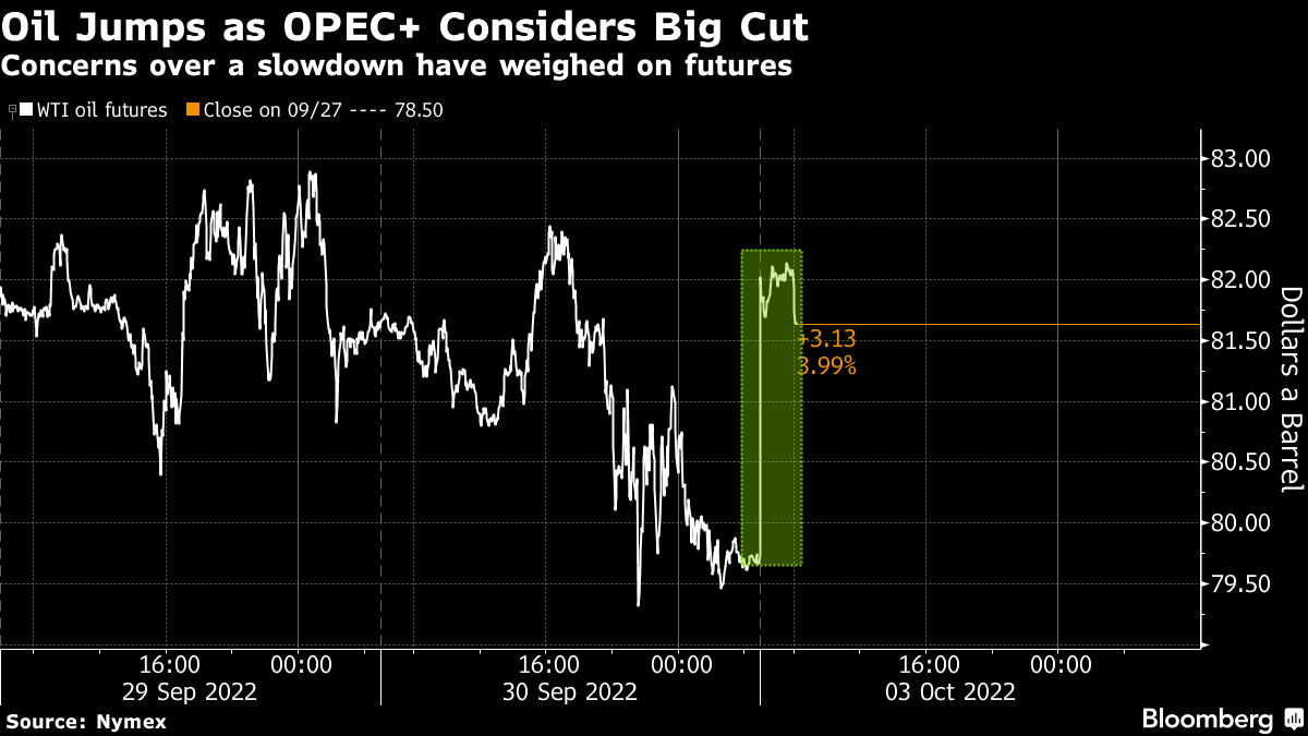 Oil surged to trade near $82 a barrel on indications the OPEC+ alliance is considering slashing production by more than 1 million barrels a day to revive plunging prices when it meets this week. Commodity currencies gained. Those moves increase the risk of more inflation that may prompt central banks to take further aggressive policy action.