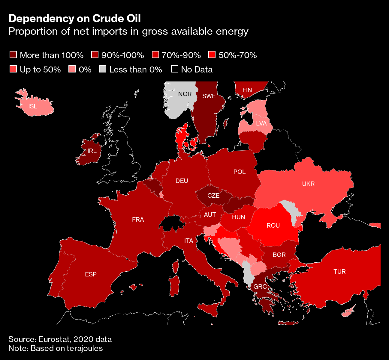 Euro-zone countries are highly dependent on imports for their oil. With next to no local crude supplies, each of the currency bloc’s five biggest economies -- Germany, France, Italy, Spain and the Netherlands -- is at least 90% dependent on foreign purchases to run refineries.