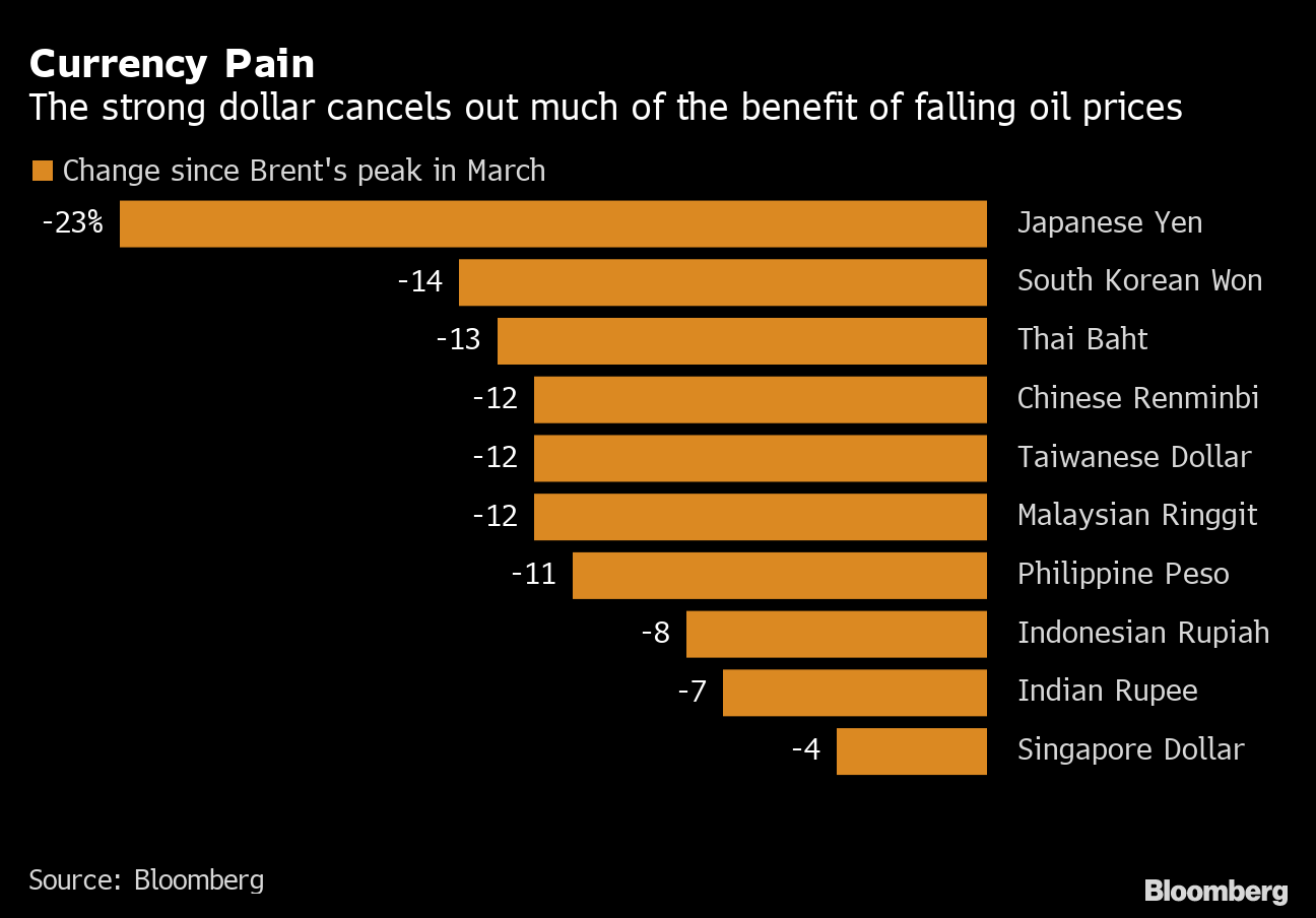 Oil-demand powerhouses like China, India and the European Union have all seen smaller real-term declines in crude prices than benchmarks would suggest. And for some emerging markets like Sri Lanka, the impact of a spiraling oil price and collapsing currency has already shown up in the form of near-total economic collapse.