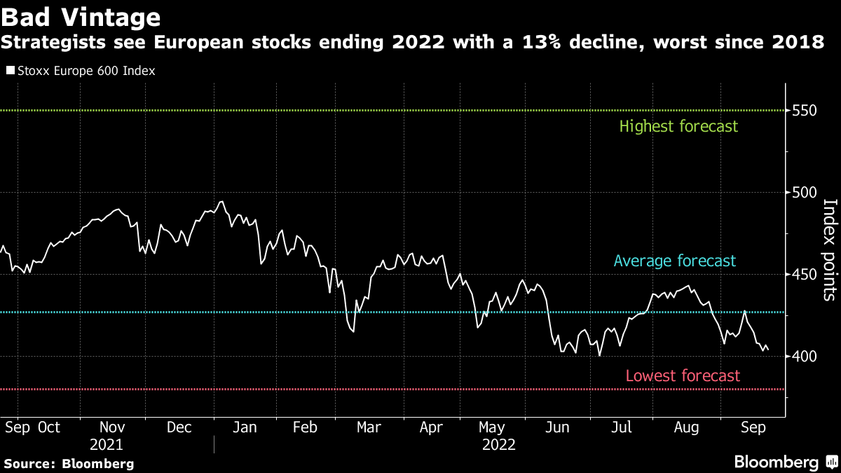 Goldman Sachs Group Inc. slashed its year-end target for the S&P 500 Index to 3,600 from 4,300, citing a higher interest-rate path from the Federal Reserve, and strategists gave up on a year-end rally for European stocks as private-sector activity in the region continued to contract.