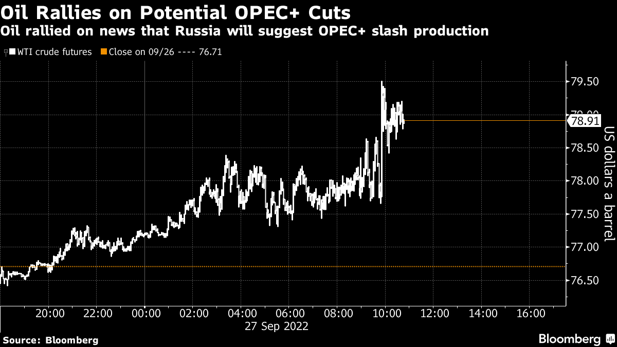 West Texas Intermediate rose as much as 3.7% to trade near $79 a barrel, reversing declines of more than 8% over the previous two sessions. Russia is likely to propose that OPEC and its allies reduced output by 1 million barrels a day at the next meeting in October, Reuters reported. Last week, Nigeria’s oil minister said in an interview with Bloomberg the production cartel would cut production if prices fell much further.