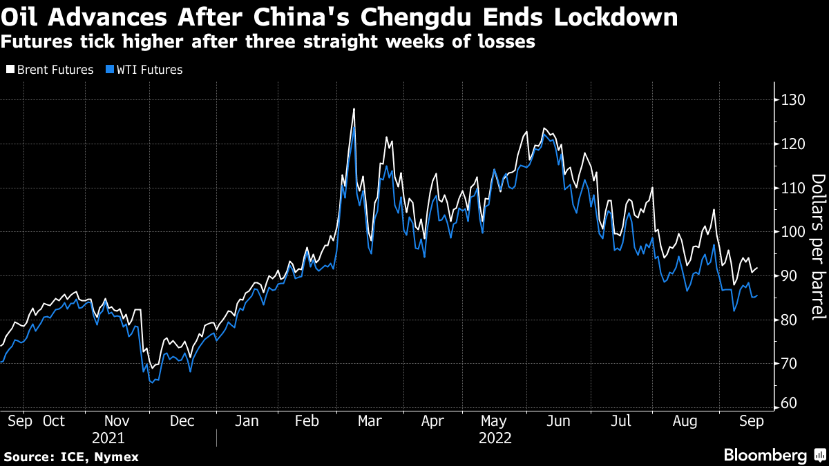 West Texas Intermediate futures rose toward $86 a barrel in Asian trading after posting a third weekly loss on Friday. Chengdu is the biggest city to have shut since Shanghai’s bruising two-month lockdown earlier this year. The capital of Sichuan province will resume most aspects of normal life from Monday.