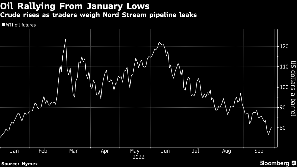 West Texas Intermediate rose as much as 3.4% to trade above $81 a barrel. Crude inventories fell 215,000 barrels last week, the US Energy Information Administration reported. The country’s demand for distillates, which includes diesel, jumped last week bringing the four-week average back above 2020 levels for this time of year. Meanwhile, leaks in three Nord Stream pipelines that began Tuesday and are widely suspected to be sabotage are prompting concerns of a broader escalation of Russia’s energy conflict with Europe.