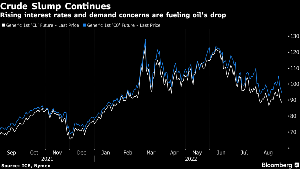 West Texas Intermediate futures dropped below $88 a barrel after falling for a third consecutive month in August in the longest run since April 2020. Investors are focusing on tightening monetary policy around the world that could crimp economic growth and hit oil demand. The lockdown of the Chinese megacity of Chengdu to contain a Covid-19 outbreak added to the negative sentiment.