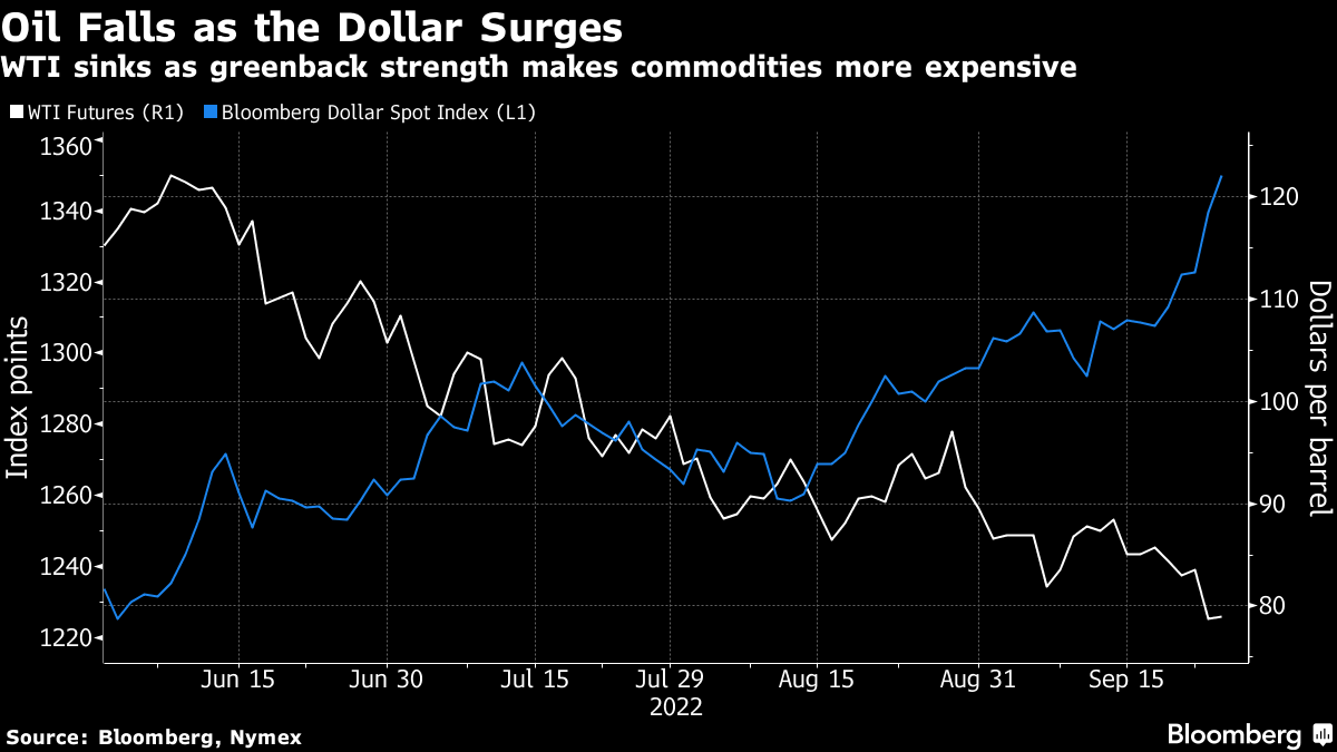 Crude is on track for its first quarterly slump in more than two years as central banks including the Federal Reserve raise interest rates aggressively, hurting the outlook for energy demand and sapping investors’ appetite for risk. The Fed’s tightening has helped to drive the US dollar to a record, making commodities priced in the currency more expensive for overseas buyers.
