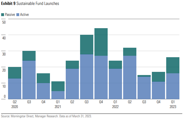 But the outflows didn’t seem to deter asset managers, as 27 sustainable funds debuted in the first quarter, up from the number of launches in the fourth quarter of 2022. And sustainable-fund assets climbed to almost $296 billion — the highest they’ve been since the first quarter of 2022 — thanks, in part, to higher equity and bond valuations, Morningstar’s report said.