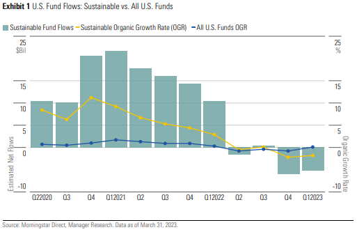Investors yanked $5.2 billion from US-domiciled sustainable funds in the first quarter of this year, according to a report by Morningstar Inc. The exodus was driven by the $13.6 billion iShares ESG Aware MSCI USA ETF (ticker ESGU), which shed $6.5 billion over that period.