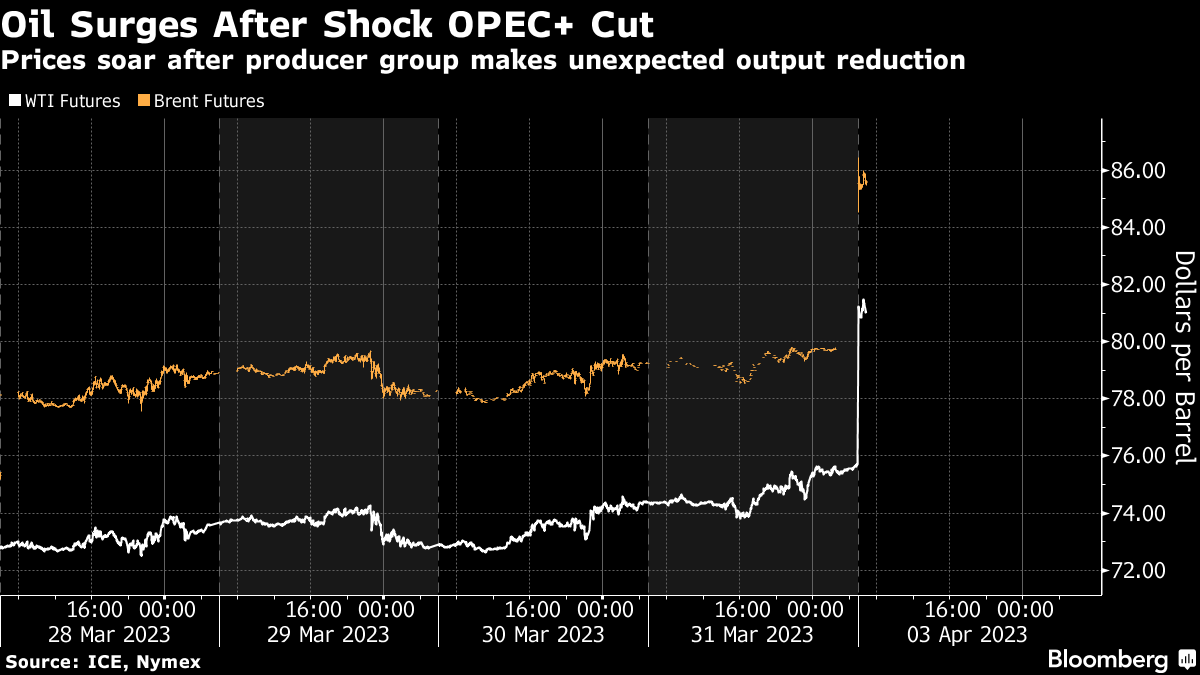 (Bloomberg) -- Oil surged at the week’s open after OPEC+ unexpectedly announced crude output cuts that threaten to tighten the market, delivering a fresh inflationary jolt to the world economy and irking the White House.