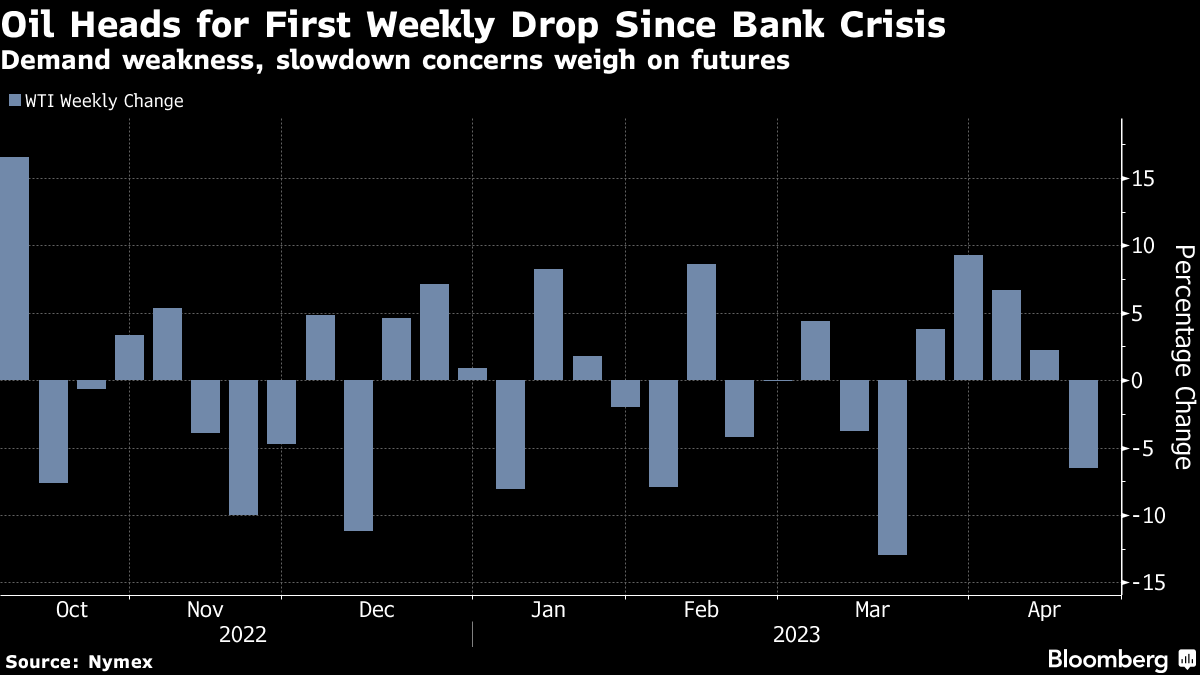 (Bloomberg) -- Oil headed for the first weekly loss since last month’s banking crisis, weighed down by concerns over demand and the US economy.