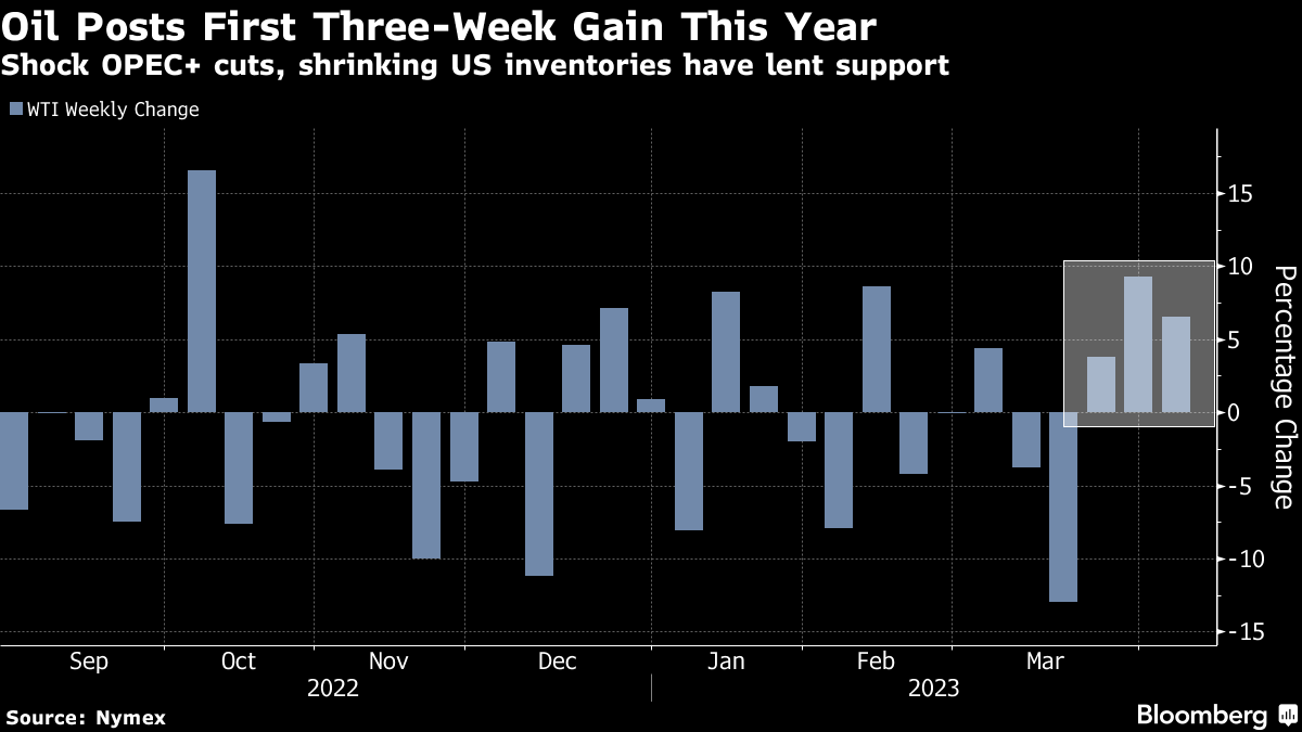 Crude has risen 26% from its intraday low reached mid-March, when banking turmoil prompted a flight from risk assets. Prices were already recovering amid growing Chinese fuel demand and a weakening US dollar when OPEC+ intervened, confounding short sellers and amplifying the rebound.