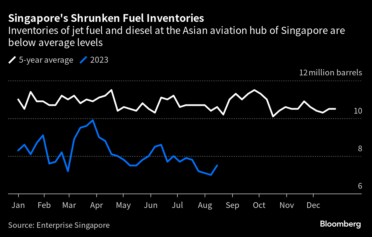 In recent months, the availability of aviation fuel has slipped, with stockpiles at hubs such as Singapore and Amsterdam-Rotterdam-Antwerp below seasonal averages. That’s due to a series of unplanned refinery outages, as well as increased diesel production at the expense of jet fuel.