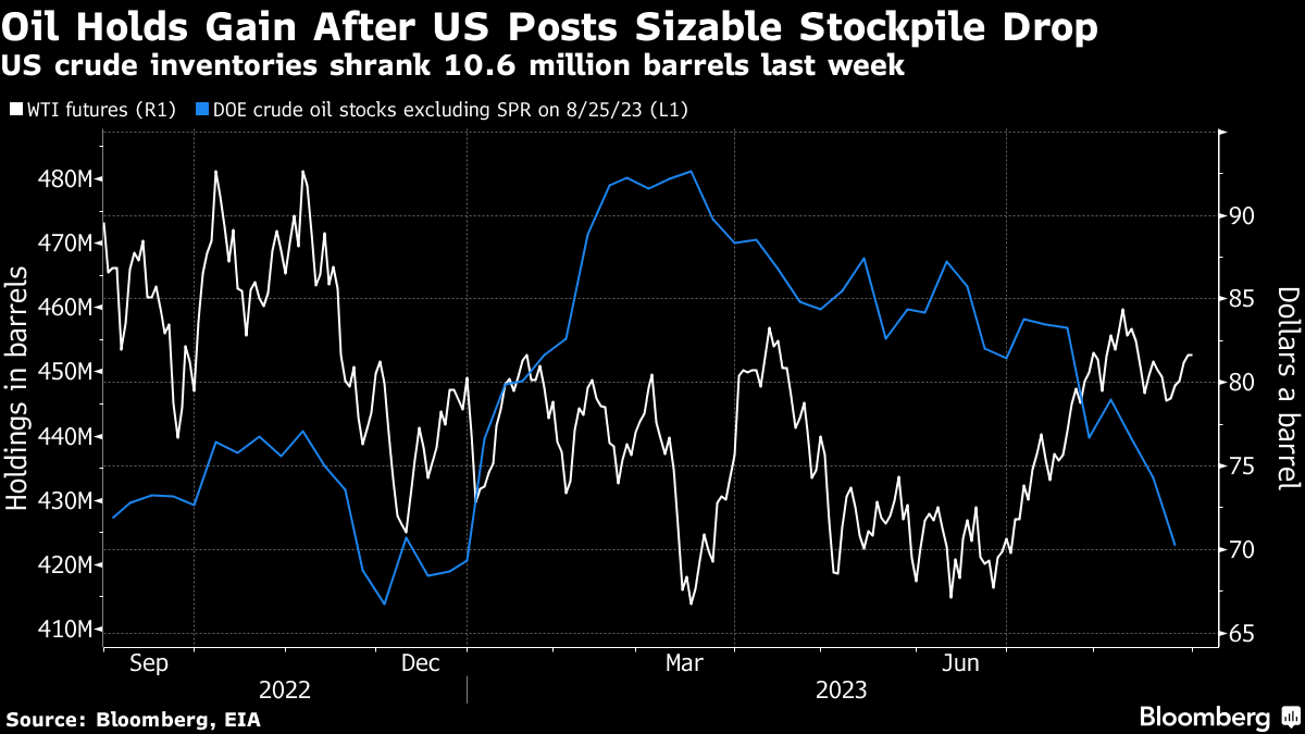 West Texas Intermediate traded above $81 a barrel, after advancing 3.5% in the longest run of daily gains since March. Stockpiles in the US fell by 10.6 million barrels last week, cutting them to the lowest since December. Inventories at the key Cushing, Oklahoma, hub also declined to the least since January.