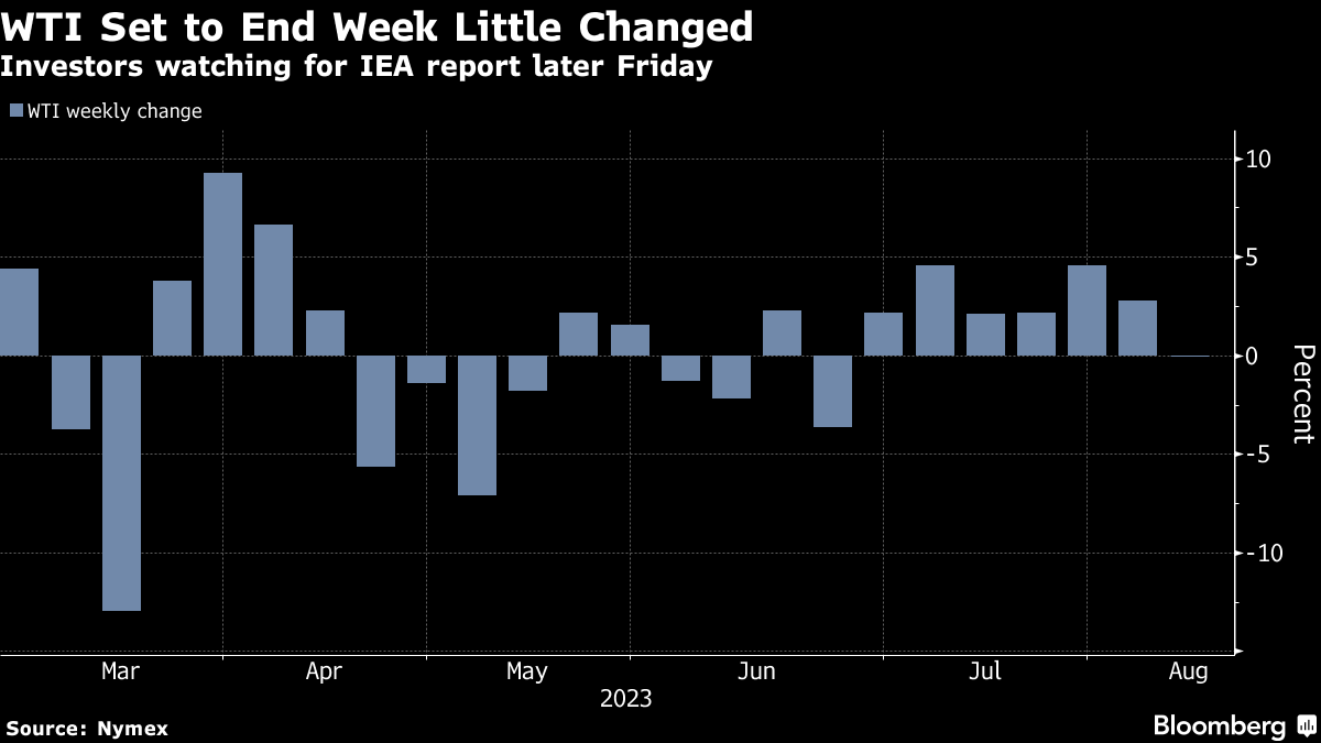 (Bloomberg) -- Oil was on track to end the week little changed ahead of a report from the International Energy Agency that will provide a snapshot of a crude market that’s tightening due to supply curbs.