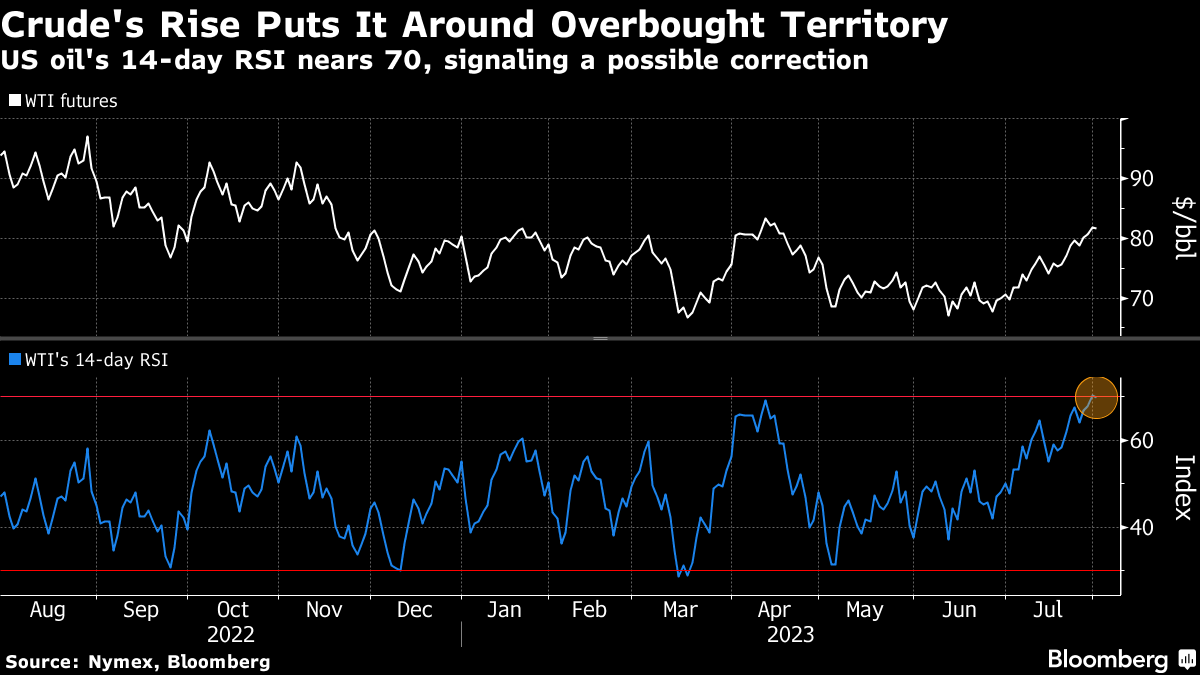 Still, crude’s climb means that its 14-day relative-strength index has risen to near 70, a level that suggests the market may be overbought in the near term and could face a downward correction. Meanwhile, oil exchange-traded funds have posted their largest week of outflows for more than a year.
