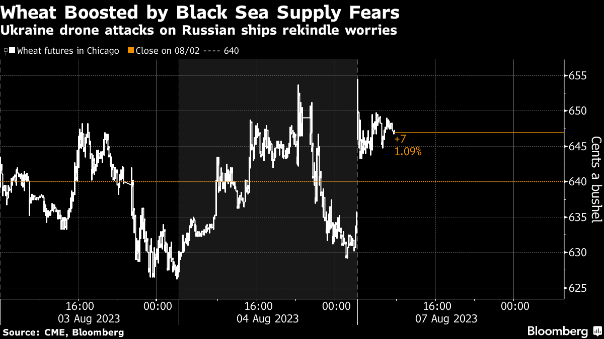 (Bloomberg) -- Wheat extended gains after Ukraine used sea drones to cripple a Russian oil tanker and a naval vessel, threatening a key export route for Russian commodities through the Black Sea.