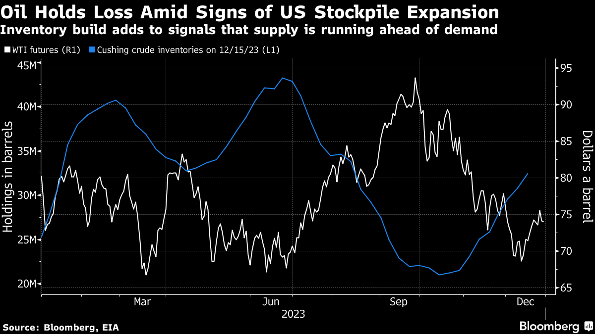 West Texas Intermediate held above $74 a barrel after declining by 1.9% on Wednesday, with Brent crude near $80. The American Petroleum Institute reported nationwide inventories rose by 1.8 million barrels, according to a report seen by Bloomberg, with levels at Cushing also expanding. That’s feeding into signs supply is topping demand as the year-end approaches.