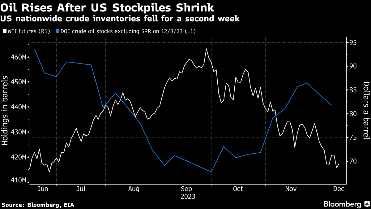 West Texas Intermediate rose toward $70 a barrel, after climbing 1.3% on Wednesday from its lowest since late June. Global benchmark Brent was near $75. US crude stockpiles fell last week about twice as much as earlier forecast, according to the Energy Information Administration.