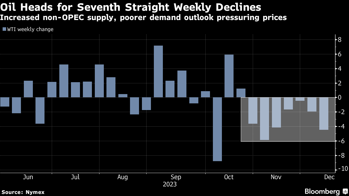 There are also concerns about the trajectory of demand. Chinese consumption is expected to grow by 500,000 barrels a day next year, according to a Bloomberg survey, less than a third of the increase seen in 2023. In the US, meanwhile, many economists see a recession starting next year.