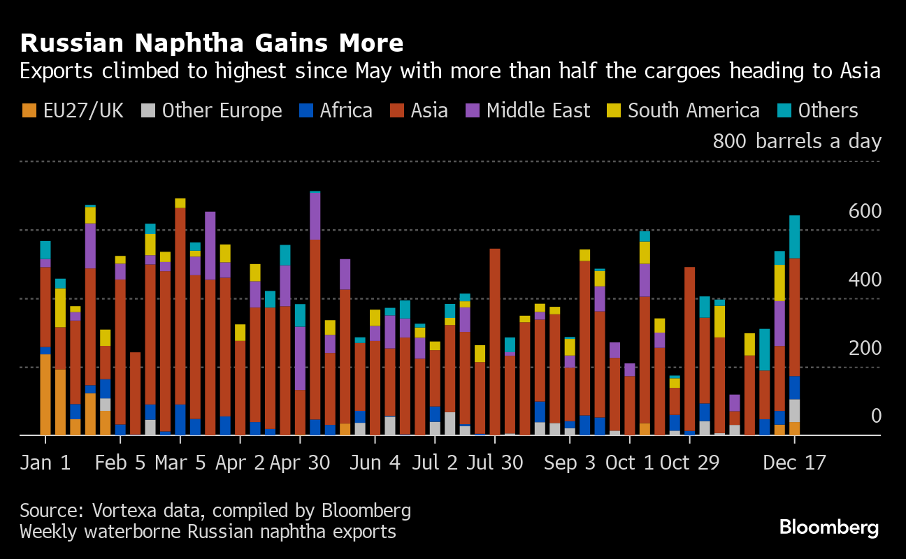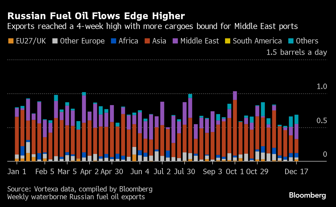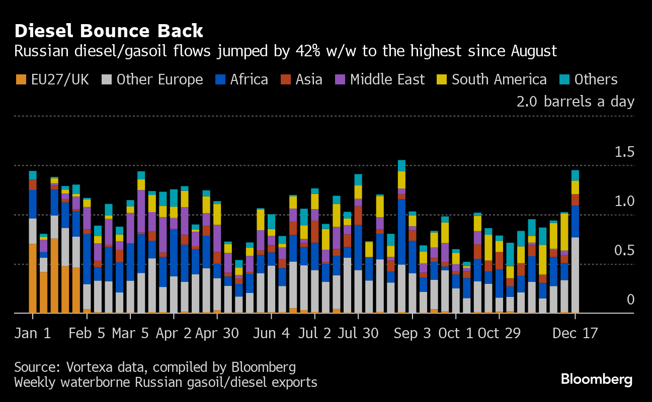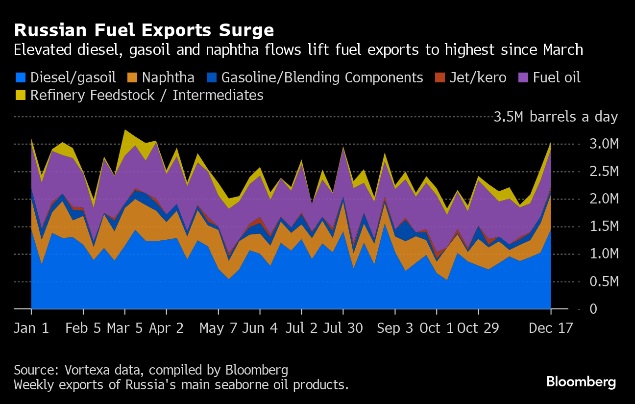 Shipments from Russia averaged 2.4 million barrels a day in the four weeks through Dec. 17, according to data compiled by Bloomberg from analytics firm Vortexa Ltd. That’s the highest volume since mid-September.