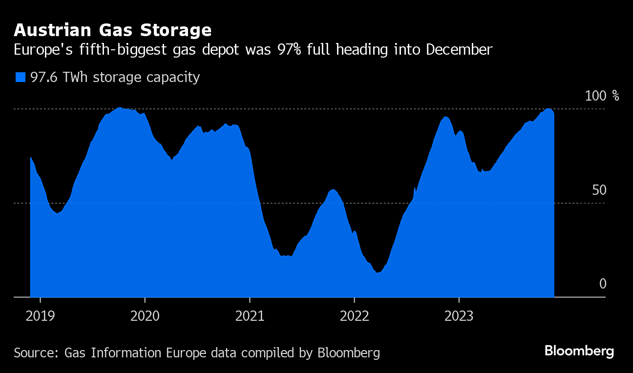 (Bloomberg) -- Austria is overflowing with Russian natural gas, allowing the longtime customer of Gazprom PJSC to boost sales to its neighbors while delaying efforts to pivot from Kremlin-controlled energy.