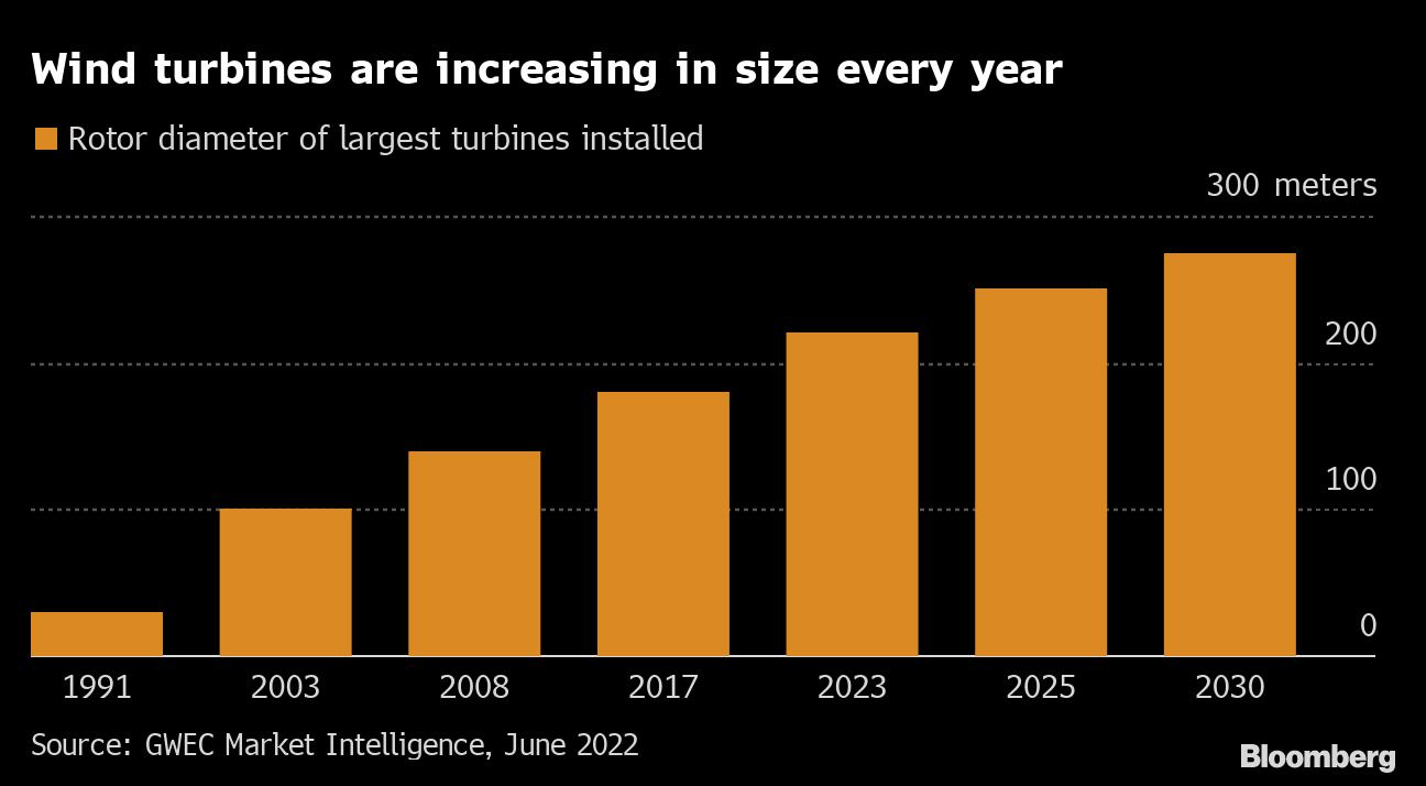 The world’s largest floating wind project, in Norway, uses turbines with a rotor diameter of more than 160 meters. As technology advances, future wind farms could see these lengths increase to 275 meters by 2030, according to the GWEC.