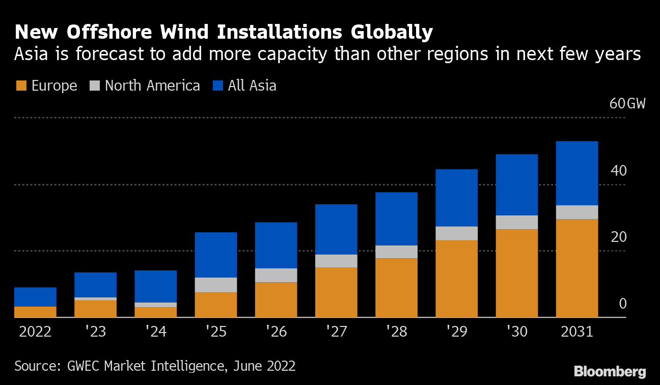 (Bloomberg) -- Asian nations counting on offshore wind farms to meet clean energy goals are facing an increasing shortage of ships for installing the massive turbines in the sea.