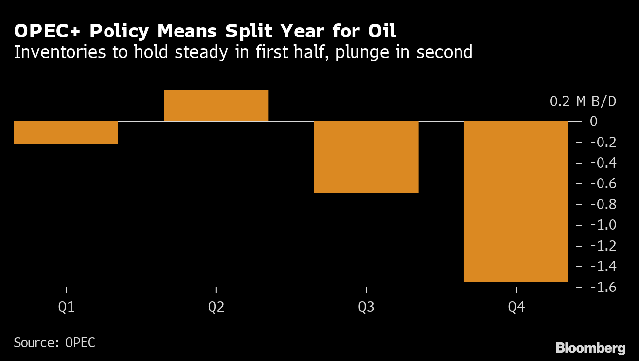 (Bloomberg) Saudi Arabia’s pledge that OPEC+ will hold oil supplies steady is setting up global oil markets for a year of two contrasting halves.