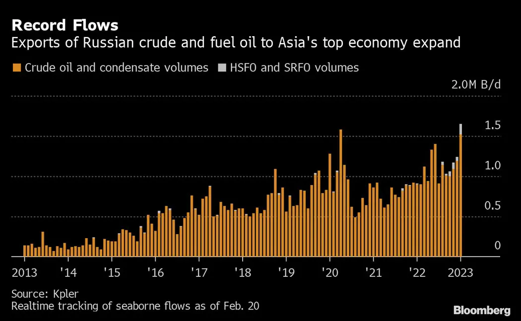 Russia’s overall crude and fuel oil exports to China reached 1.66 million barrels a day last month, according to Kpler data as of Feb. 20. That’s more than the previous record set in April 2020 when the Asian nation was emerging from its initial virus restrictions. Crude and condensate flows rose to 1.52 million barrels a day, just short of a record set almost three years ago.