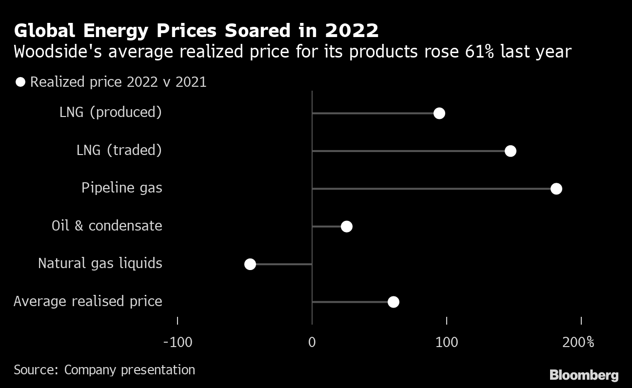 Natural gas benchmarks in Europe and Asia soared to unprecedented levels last year as European nations usually dependent on Russian fuel hunted for alternatives following the invasion of Ukraine. Woodside, which supplies about 5% of the world’s LNG to mainly Asian buyers, was among the beneficiaries, even sending a rare cargo all the way to the Netherlands from Australia.