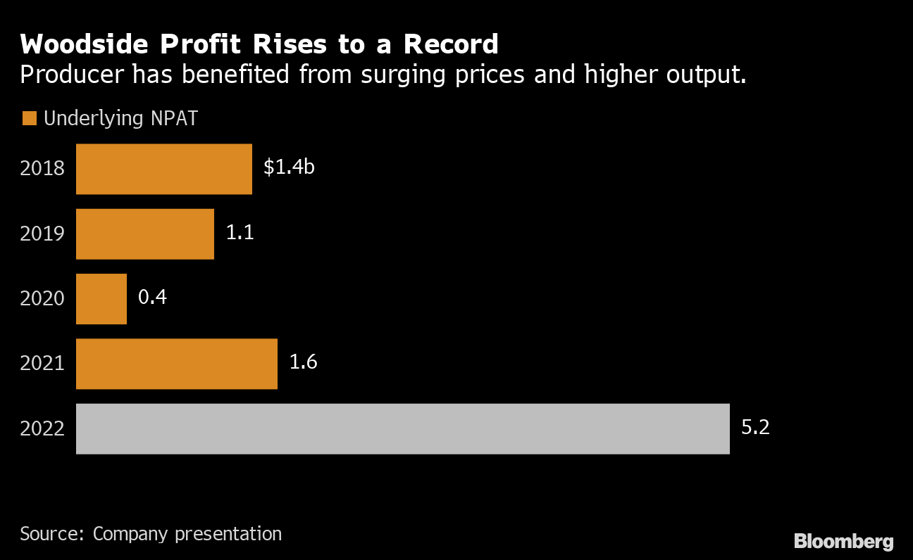 Underlying earnings more than tripled to $5.2 billion in 2022 on soaring energy prices and output that jumped more than 70% after the purchase of BHP Group Ltd.’s energy unit, the company said Monday. The result follows a run of bumper profits for global oil and gas producers, including Australia’s Santos Ltd., BP Plc and Shell Plc.