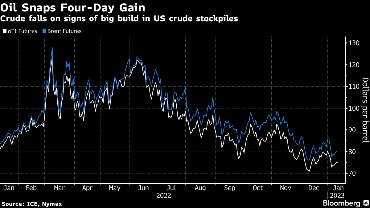 West Texas Intermediate dropped below $75 a barrel after adding around 3% over the past four sessions. US crude stockpiles rose by 14.9 million barrels last week, the American Petroleum Institute reported, according to people familiar with the data. If confirmed by the Energy Information Administration later Wednesday, it would be the largest increase since February 2021.