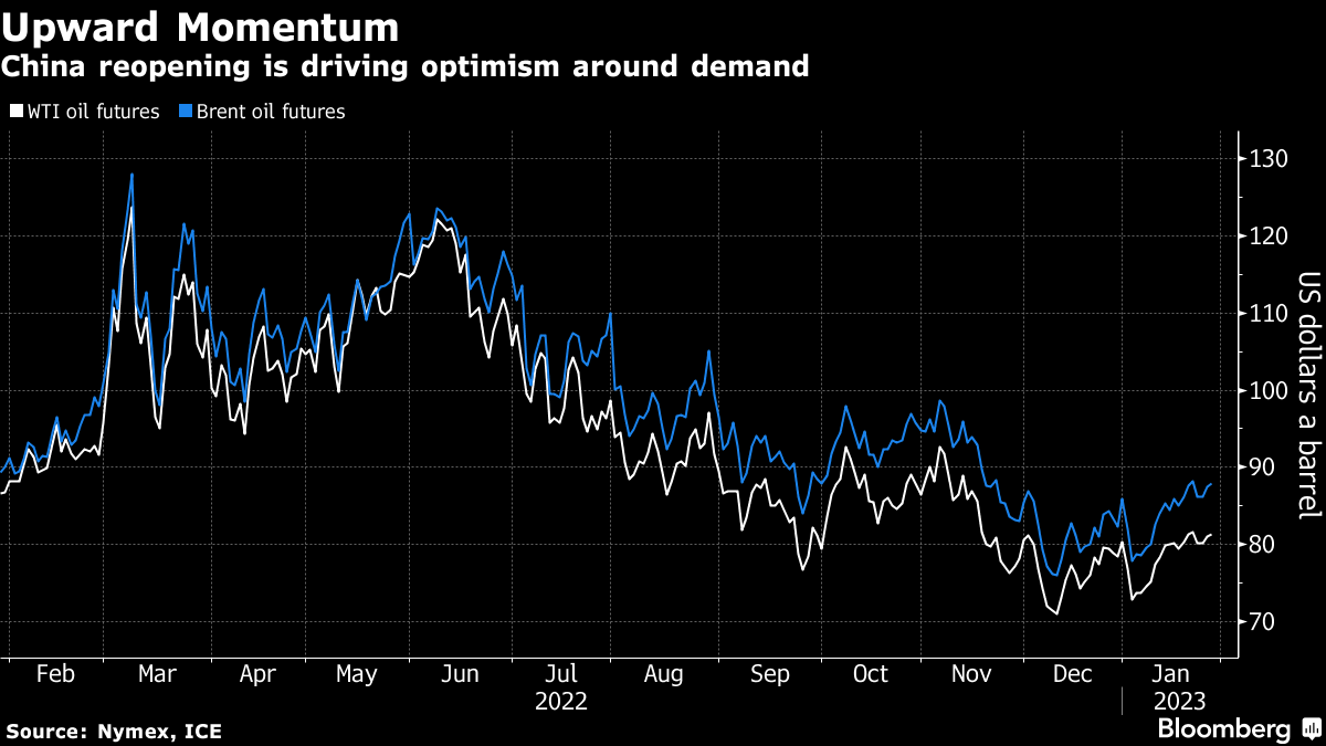 West Texas Intermediate futures gained for a third session to trade above $81 a barrel on Friday. Trafigura Group sees “a lot of upside” for oil markets as pent-up demand is unleashed, especially as Chinese consumption rebounds after the nation dismantled its strict Covid Zero policy.