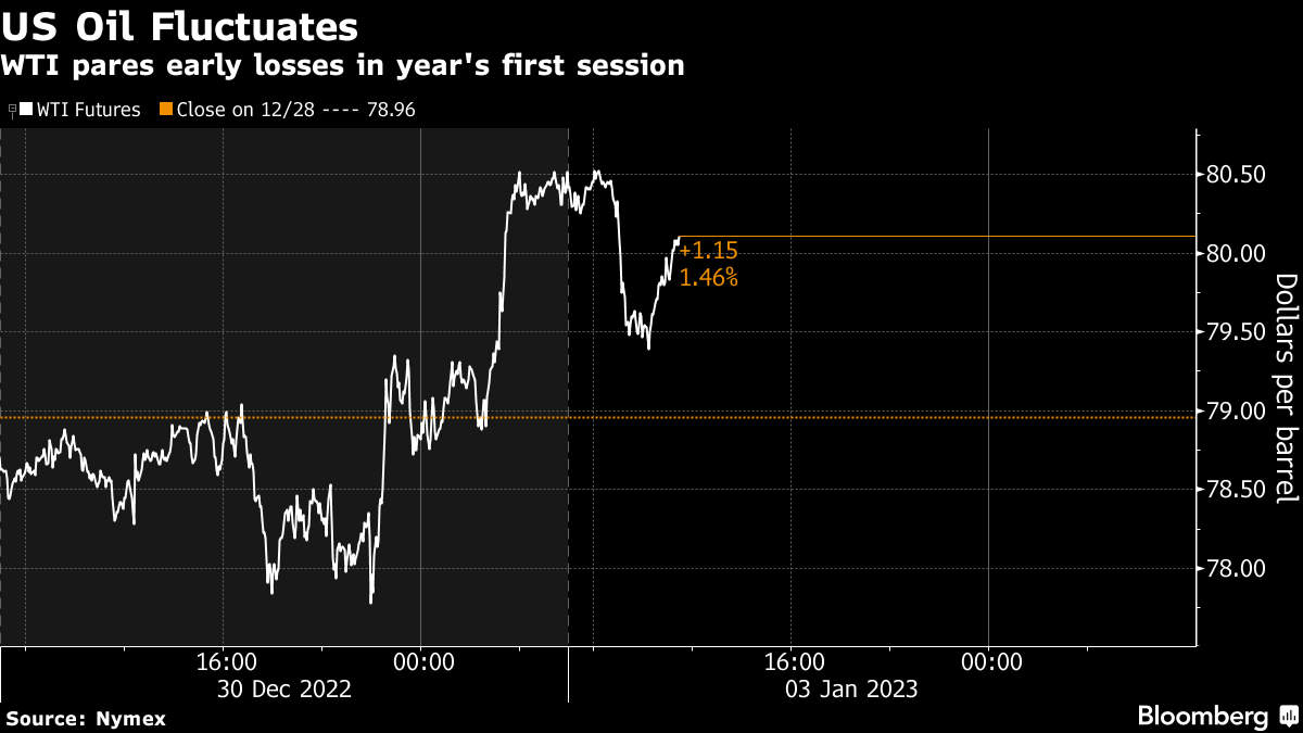 West Texas Intermediate traded near $80 a barrel after closing 2.4% higher on Friday to cap a modest annual advance. In China, President Xi Jinping said that tough challenges remain in the nation’s fight against Covid-19, with cases surging after anti-virus curbs were abandoned. Official data showed that the country’s economy ended the year in a major slump.