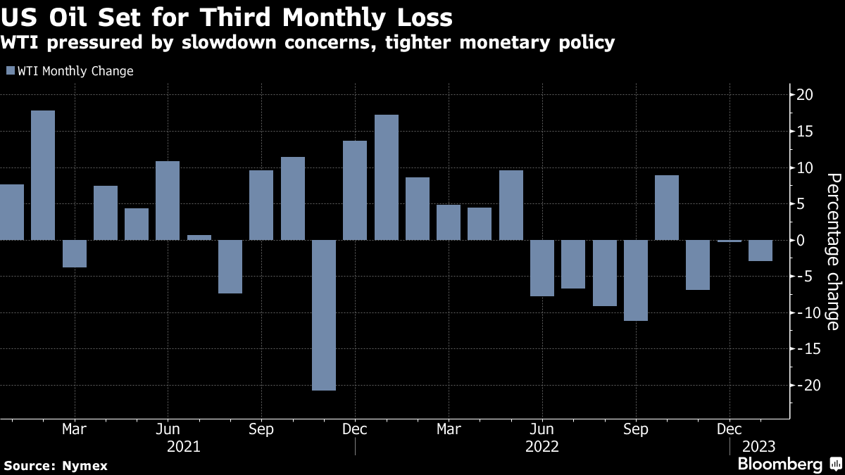 Crude has endured a bumpy ride in January, and is now on course for a third consecutive monthly decline as concerns about a US slowdown overshadowed optimism on China. An advisory committee of ministers from the Organization of Petroleum Exporting Countries and its allies will review production policy later this week, although no change is expected. Its session comes ahead of the next round of sanctions and caps on Russian energy flows.