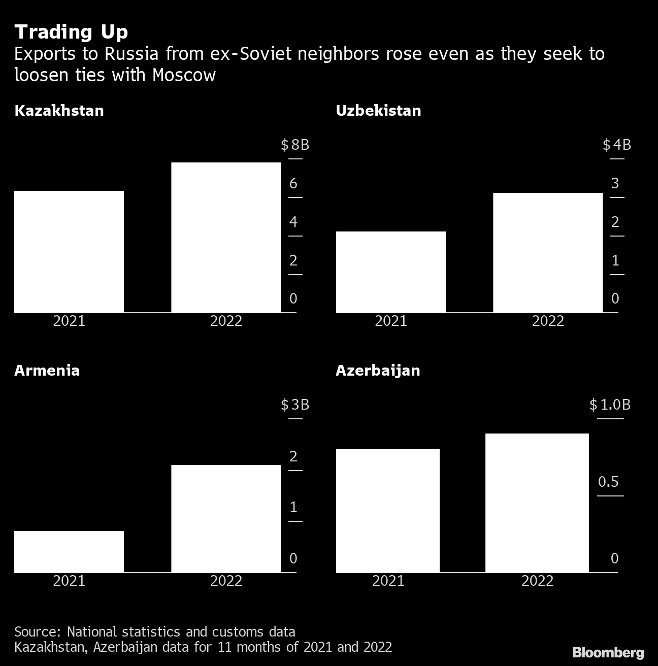 To be sure, Russia remains a powerful force in the region. With international sanctions in response to the war blocking Russia’s westward trade routes, Moscow’s ex-Soviet neighbors have become even more important to it as conduits for trade. Exports to Russia from other members of the Moscow-led Eurasian Economic Union -- Belarus, Kazakhstan, Armenia, and Kyrgyzstan -- have soared, as goods are rerouted from Europe. Turkish exports to Russia have also increased.