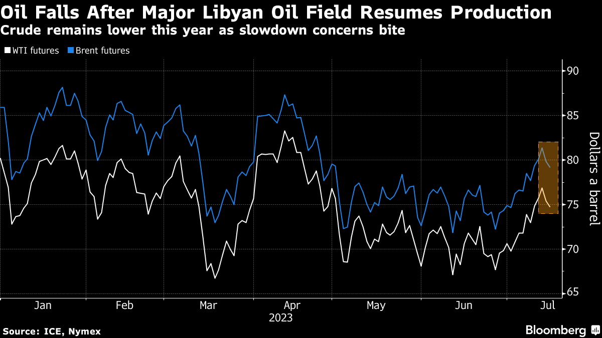 Global benchmark Brent dropped toward $79 a barrel after losing 1.8% on Friday. Production was restarted at Sharara, one of Libya’s biggest oil fields, after protesters left the site, a person familiar with the matter said. Before the disruption last week, it was producing about 250,000 to 260,000 barrels a day.