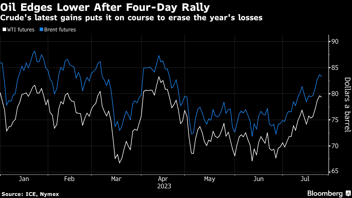 (Bloomberg) -- Oil edged lower after a four-day rally of almost 6% as traders took stock of the advance and looked toward a US interest-rate decision.