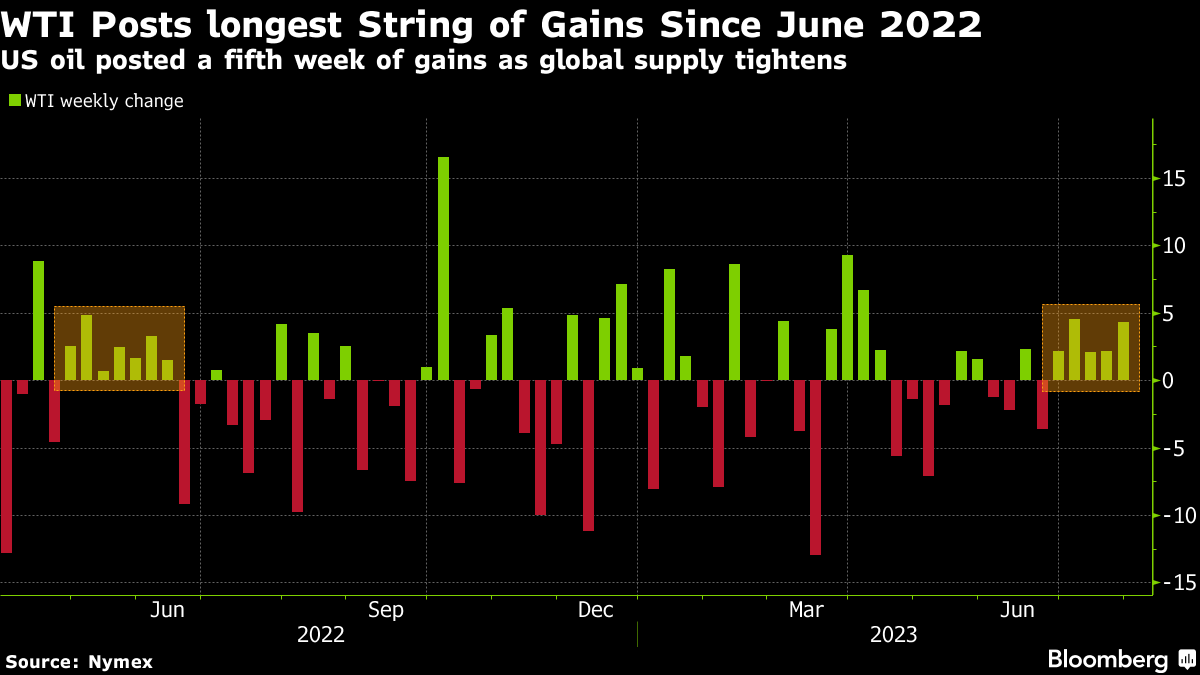 West Texas Intermediate broke through the psychological level of $80 a barrel this week, capping a rally that started in late June and has nearly erased this year’s losses. Driving the advance are OPEC+ linchpins Saudi Arabia and Russia curbing exports, with Moscow reaffirming its commitment to those obligations this week. That has led banks, including Standard Chartered Plc and UBS Group AG, to forecast tightening global balances in the coming months.